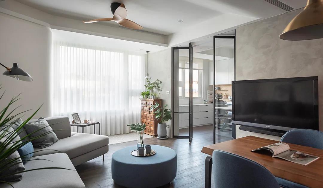 将工作室出入口重新调整位置,采用铝框玻璃折叠门使其与客厅相互串连,通敞幽邃的视野景象,让日光空气径自流通。
