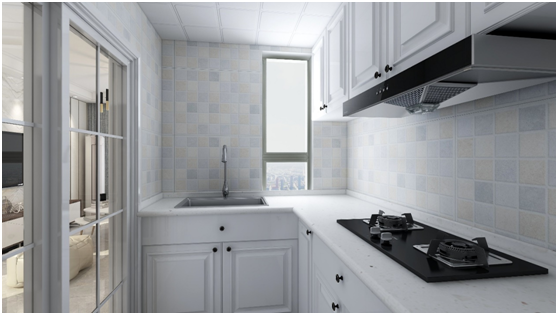 这个厨房属于L型厨房,首先先说明下L形的厨房布局是什么,这是指所有的工作区沿两面挨着的墙布置,水盆放到窗户一侧,操作台和灶台放在另一侧,形成一个三角的操作空间,符合清洗、加工、烹饪的顺序。因为采光问题,整体柜子用的白色为主色调,墙面用了浅色但又显得丰富颜色的砖,使得整体空间没有那么单一。