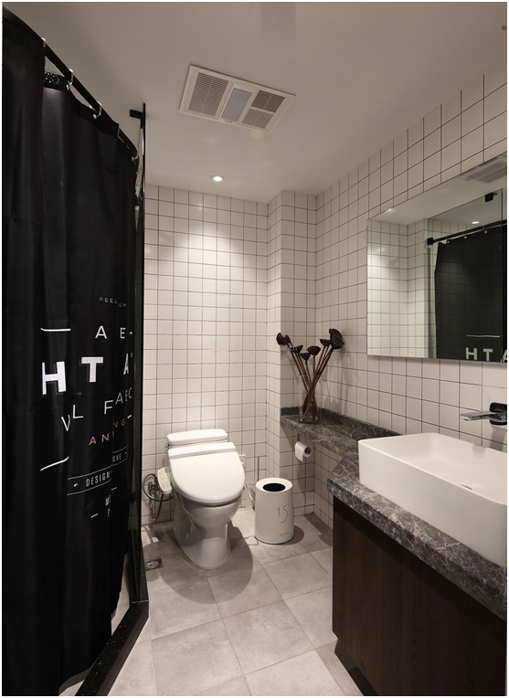 卫生间的深浅搭配看起来很舒服,深色木质浴室柜看起来更有质感,浅色墙砖搭配深色腰线使整体空间更具层次感,坐便后面的背景设计使得整体空间看上去不再单调。整个卫生间以业主的生活习惯为出发点,简洁大气并具有功能性。