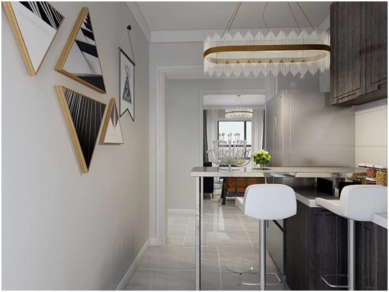 弘艺装饰的设计师考虑到整体色彩不易偏暗,所以客厅餐厅采用大面浅色墙漆做背景色,隔板及绿植来点缀,让整体效果更简洁,明快。家具采用深色对比色,用绿植来调色,使得整体空间更清新活跃。