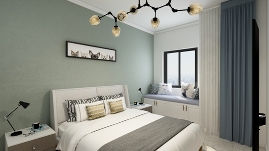 睡床是沿着窗户摆设,两边预留阿足够的走动空间,床头背景粉刷灰绿色墙漆,突出床头背景,与地面地砖颜色相近,看起来甚是和谐。床品采用浅灰色软包形式,增加卧室的舒适感,配上深灰色的床品床头两边金属材质的台灯凸显了整个空间的大气感,床旁边有一个大大衣柜增加了整个屋子的储物空间,卧室顶面采用石膏线,从视觉不会显着压顶.现代住所的开展,小家庭的组成,大家心理上的需求,期望卧室具有私密性、蔽光 性,配套洗浴,静谧舒服,与住所内其他房间分隔开来。我规划的卧室除了主卧加了个内卫外,再者除了摆放双人床外,留有必定的面积摆放卧室家私,如衣柜,电视柜,床头柜,还留有必定空间能够休闲活动