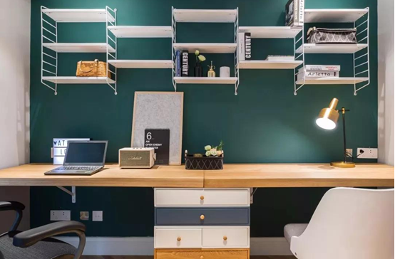△位于客厅沙发背后的书房空间,灰色和青色的墙面形成对比,把钢琴和书桌区域分开,墙面的置物架搭配双人书桌的设计,满足了书房的收纳需求