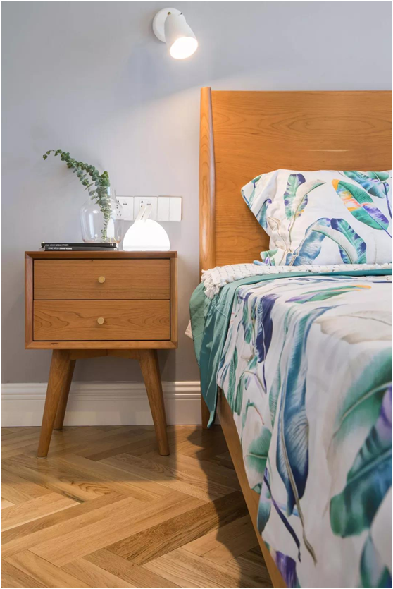 △高脚床头柜,既有很好的储物、置物功能,又方便打扫。床头柜的小灯补充照明,也便于随时开关。
