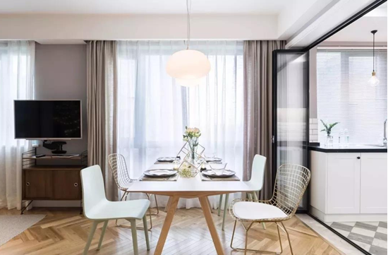 客厅的整个色调分为三个部分,一是墙面的浅灰色,低调中又带点清新,二是吊灯的暖白色,干净大气,三是地板上的木色,三个颜色形成三个大色块。客餐厅地面都是相同人字拼接的木地板,让整个空间的整体感和纵深感得以提升。