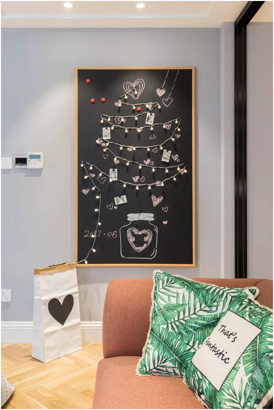 △书房和客厅之间的墙面还挂了一个小黑板,可以用来记录屋主一家的点点滴滴,小串灯的“之”字形像是棵圣诞树,让这个地方多出了文艺小清新的感觉。