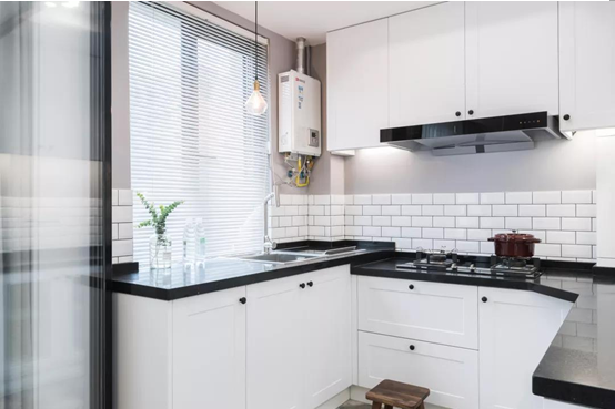 △用折叠式玻璃门将厨房和餐厅隔开,玻璃门既阻挡了油烟的蔓延,又保证了厨房的采光通透性,有利于做饭时家人之间的沟通。厨房门旁边的仙人掌在空间上也起到了一定的隔断作用。厨房内部是U字型的橱柜布局,白色的柜体、黑色的台面、小白砖、灰色墙漆的运用,让厨房层次分明,折叠门的使用也让厨房平时更显宽敞。
