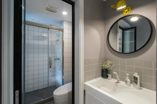 △卫生间做了干湿分离,把洗手台外移到卫生间门外。地面和墙面还是主色调低调的浅灰色。马桶和淋浴区之间也做了隔断,再也不用担心水汽的烦恼。圆形镜子上有一个黄色的小臂灯,用来补充照明?!鞔堪咨南词痔ê颓矫娴那郴疑∽┬纬啥员?,台面上放置了一个小花瓶,作为装饰。