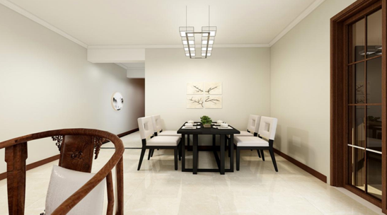 考虑到业主的浪漫主义情怀,餐厅为业主选配了一款吊灯,黑檀色的餐桌遇上了白色的餐椅,显得干净、整洁,且不失稳重,又彰显活泼。餐厅的空间也不是很宽敞,所以没有做餐边柜和酒柜,餐桌的上方一组简洁的装饰画,会让家里更加温馨,饭菜也将更有食欲。