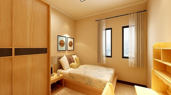次卧室是女儿房,考虑到小姑娘一天天的在长大,所以并没有给她布置成特别明显特征的儿童房,也没有选择公主粉,更多的是考虑其休息、储物和学习的功能性。1.2米的单人床一个人睡觉是非常舒服的,旁边放一个床头柜也足够用了,考虑到空间的限制,书桌智能放到床尾的位置,因为床头柜的旁边要放一个1.5米的衣柜。