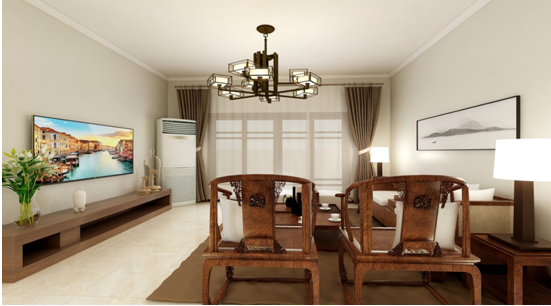 业主在开始咨询装修的时候,就想做中式或新中式的风格,后期家具配饰呢也是在朝着这个方向努力。在宜居的同时又不喜欢太复杂的造型,同时电视墙又比较短。所以电视墙并没有做什么修饰,其实电视往墙上一挂也没有多少空间了,沙发背景配以一副新中式的装饰画,还是比较有意境的。