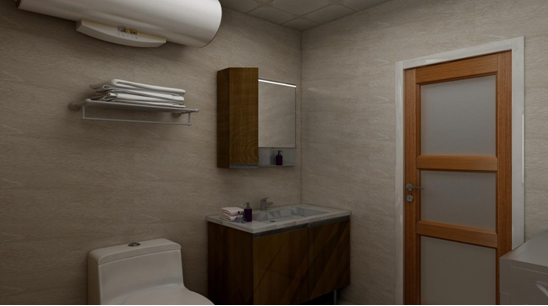 因为业主不希望空间太冷,卫生间在选择瓷砖的时候选用了暖色系瓷砖,空间不是很大,所以没有做淋浴隔断,洗衣机放到门后,一进门看到的是洗手台,因为洗手台的使用频率要远高于洗衣机,这样的布局最为方便。卫生间的门一定要选择金属材质,不能用木门。