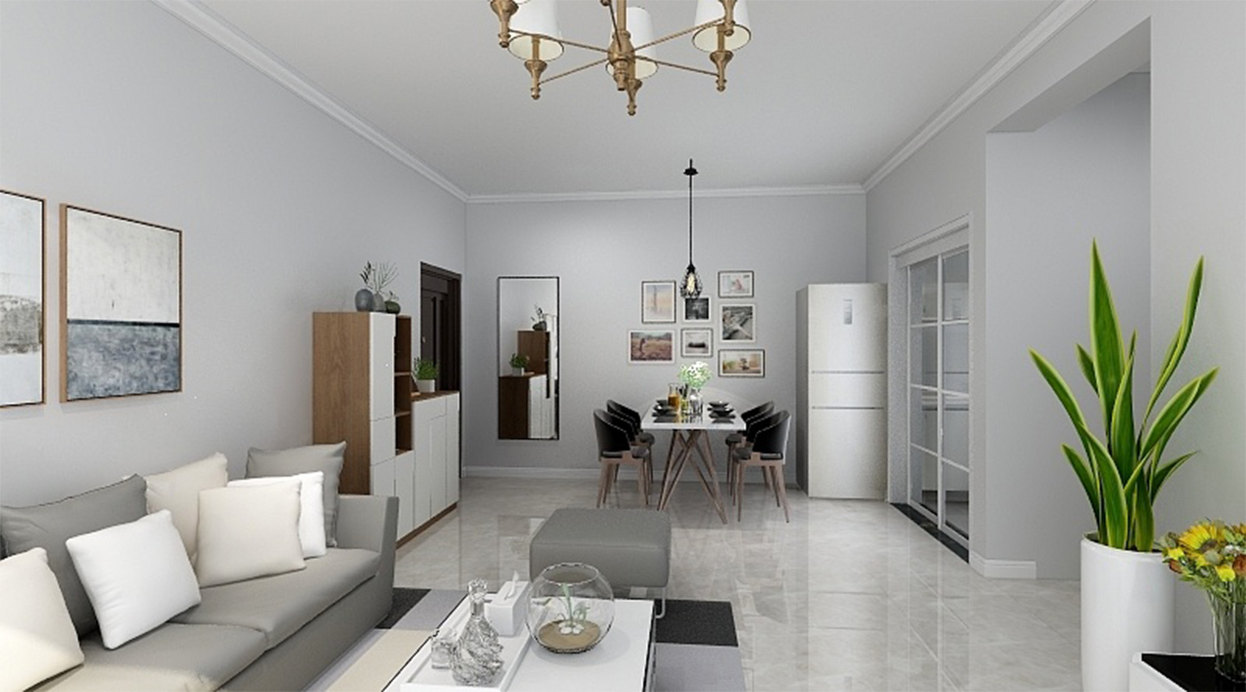 1:客餐厅由于面积不算很大,所以在色彩搭配上尽量选用浅色这样布局很容易出效果,还会由于空间比较明亮,还会使室内空间显得很大,产生一种视觉错觉。以及在后期家具选择上选用北欧风的家具,不仅尺寸不大,但是功能性很强,这样的话就不会摆完家具后不会显得小或者拥挤。