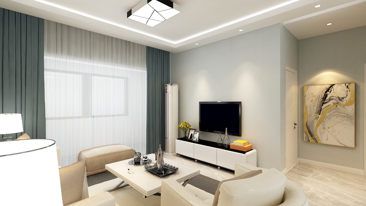 这套现代简约的客厅设计以色为主色,运用淡蓝色的墙漆和米白色的沙发搭配,让客厅充满现代的气息,十分的简洁时尚。米白色的沙发搭配灰色的地砖和蓝色的窗帘及淡蓝色的墙漆,让简约的客厅充满现代时尚温馨的气息,所以说现代简约并不是过于强调简约的设计,而是简约和实用美观的结合。