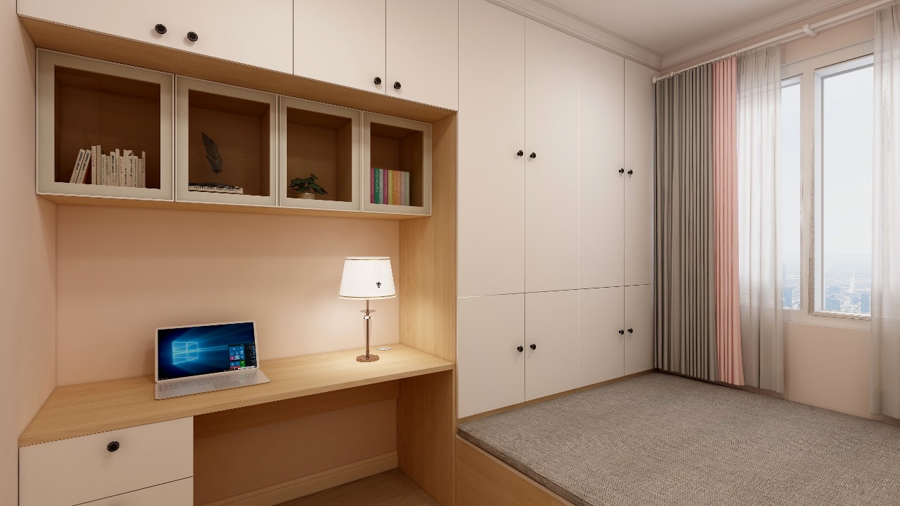 因为考虑到储物空间及常住人口数量,考虑次卧室做了个榻榻米,榻榻米打破了垂直空间收纳的惯例,内部柜子在水平地面也能发挥超强的储物能力,是提升空间利用率的先行者。这样既增加了整体的储物空间又兼具写字台及书柜的空间。颜色上考虑用原木色和白色这两种经典颜色做搭配,墙面搭配上孩子喜欢粉色。