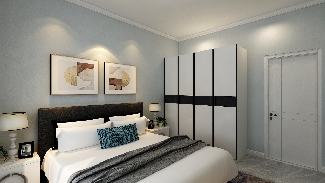 在卧室的设计上,要追求的是功能与形式的完美统一,优雅独特,简洁明快的设计风格。顶部是白色墙漆,墙面上是和客厅统一的淡蓝色的墙漆,浅色的家具上深色的装饰线条,使得整体设计简单又带有活力。在卧室设计的审美上,追求时尚而不浮躁,庄重典雅而不乏轻松浪漫的感觉。因此,在卧室的设计上,会更多的运用丰富的表现手法,使卧室看似简单,实则韵味无穷