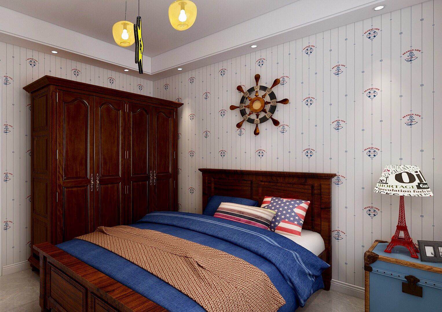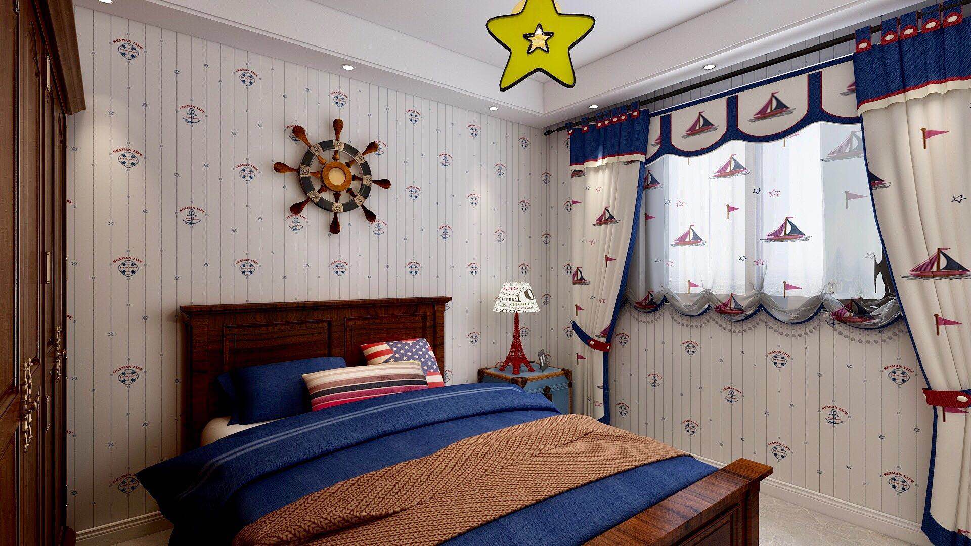 次卧室为儿童房,主人孩子现在还比较小,整体色调以蓝色为主,整体清新自然,次卧选用了一个非常有趣的壁纸运用了很多的复古元素,打造了一个温馨且有层次感的卧室空间,整体没有过多的复杂装饰,为业主提供的简单的睡眠空间。