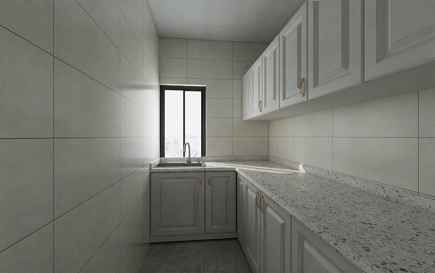 厨房橱柜整体色调为浅色调与其他空间家具的整体色调形成一个反差,整体定制橱柜搭配浅色系的墙地砖整体感觉更加清爽,地面地砖是延续客餐厅整体铺过来的,这样就避免小地砖缝隙多存杂物的问题,厨房整体空间比较狭长 ,橱柜也是做的L橱柜,配的吸塑材质的门板,并且因为厨房空间不是很宽敞所以没有把冰箱考虑在此空间,这样整个厨房的整体橱柜完全可以满足业主的储物及操控空间。让我们为你打造属于你的个性美居。。。