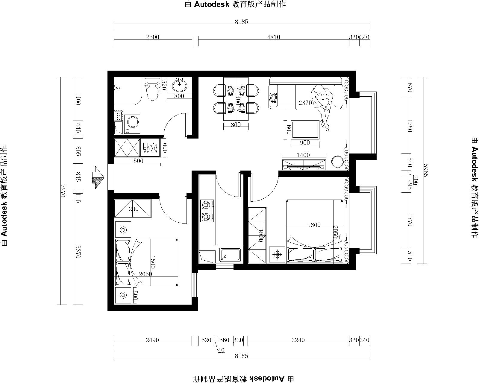 原始图分析:本方户型为两室一厅双阳面户型,客餐厅一体式的户型,客厅和主卧室都有一个大大的飘窗,便于休闲和观景,厨房属于细长型结构,但不适合把冰箱考虑在里面,卫生间空间比较大能够合理摆放洁具。