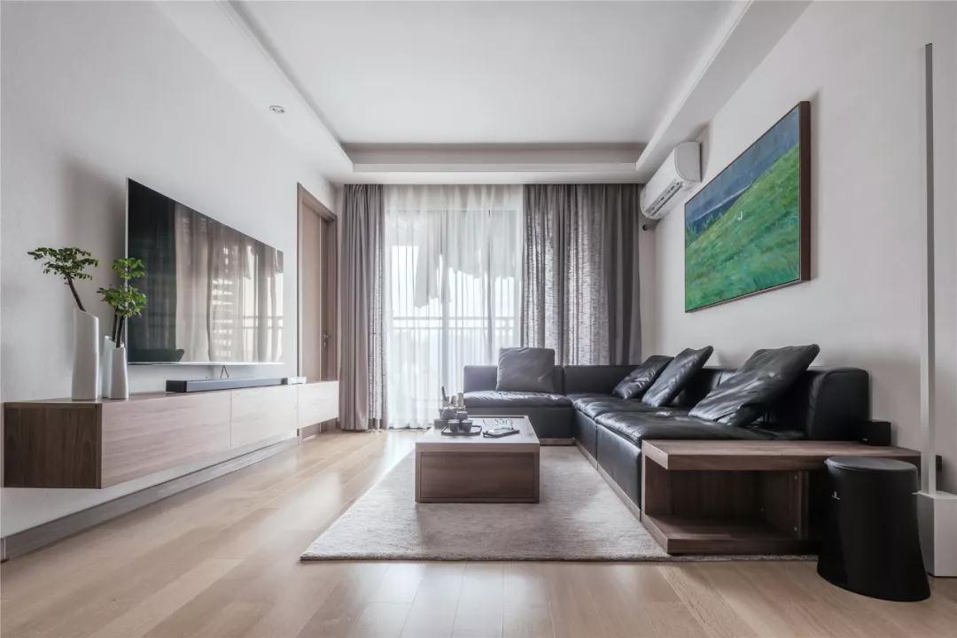 电视背景墙简约而利落,木质电视柜悬空而置,摆放极简花瓶与绿植,带来一种轻松自然的感觉。