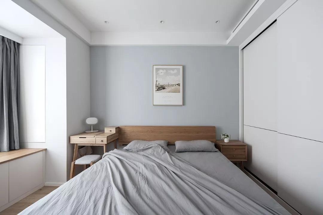 卧室采用冷静而克制的灰蓝色调,木质的清香深沉,在棉麻床品的柔软中,对比出一种宁静致远的闲适。