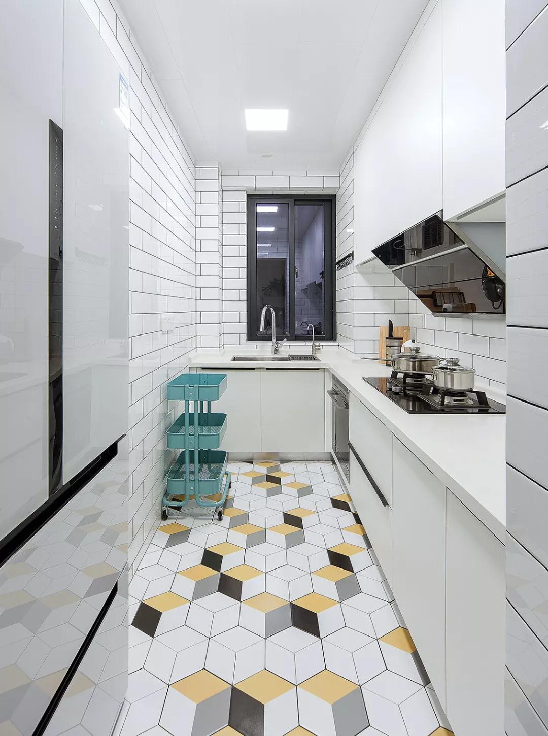 L型橱柜合理做了厨房收纳,白色与黄色的结合碰撞,构造出一个纯净明亮的空间。