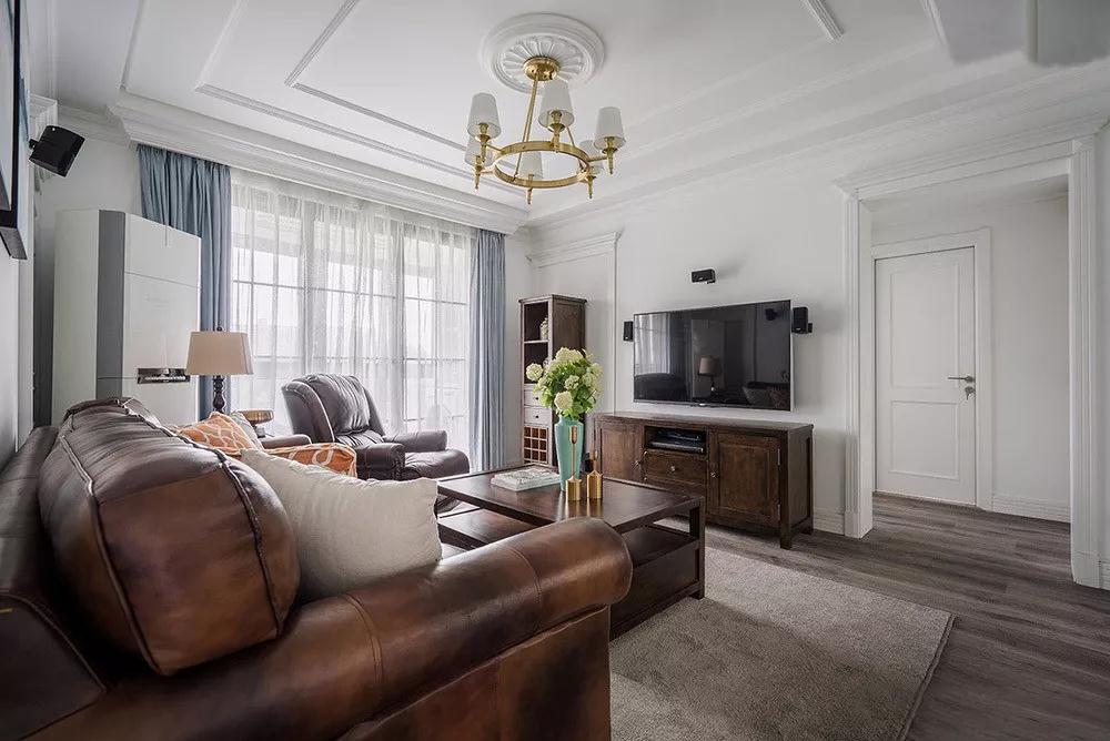 客厅在整体白调的基础氛围下,墙面和天花都做了精致的石膏造型?;?蓝色的窗帘,给整个空间带来一份安详与洁净。 深棕色皮质沙发+铆钉的点缀,带来了大方、典雅的气质。沙发墙上的装饰画增添一种意境的美感,起到点睛的作用
