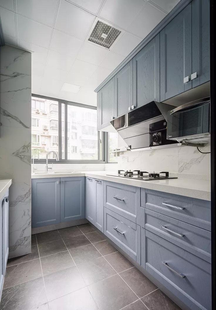 厨房区域运用了爵士白的墙砖来点缀,带动了橱柜的蓝灰色面板,使整体的质感得到了提升。