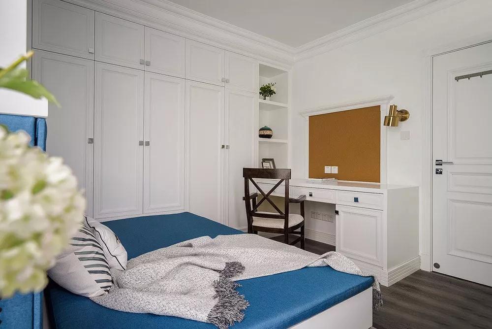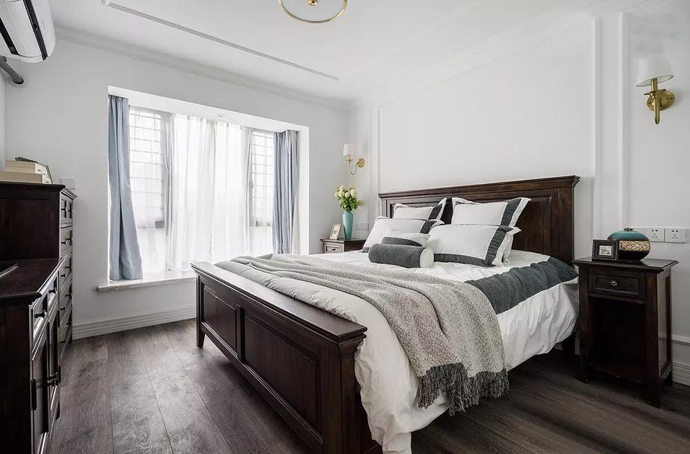 主卧延续客厅的风格,搭配深木色的实木床,结合美式的细节软装,整个卧室都沉浸在端庄柔和的气息中。