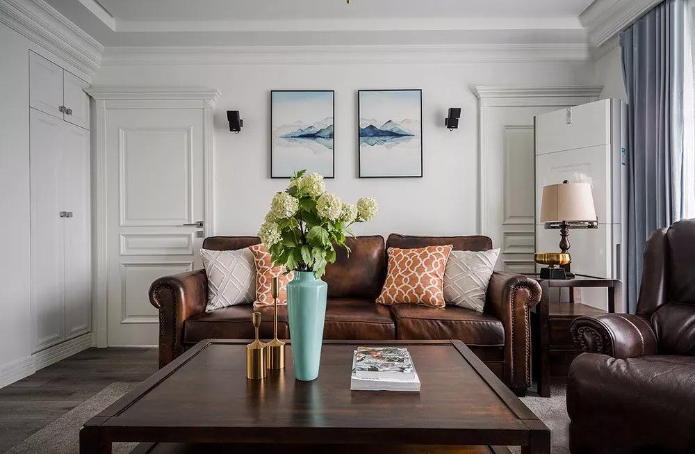 深棕色皮质沙发+铆钉的点缀,带来了大方、典雅的气质。沙发墙上的装饰画增添一种意境的美感,起到点睛的作用。