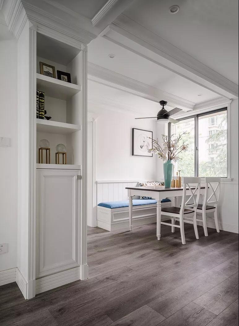 餐桌靠墙一侧设计了一排带储物的卡座,增加储物空间,同时使餐厅变得更加通透和宽敞。