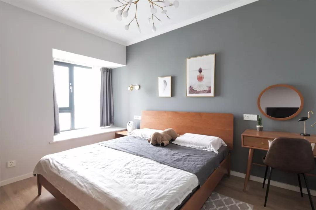 主卧,深色后退色墙面增加空间进深,选用木色的家具,以接近自然。床头的挂画和金属壁灯,提升空间品位与格调。