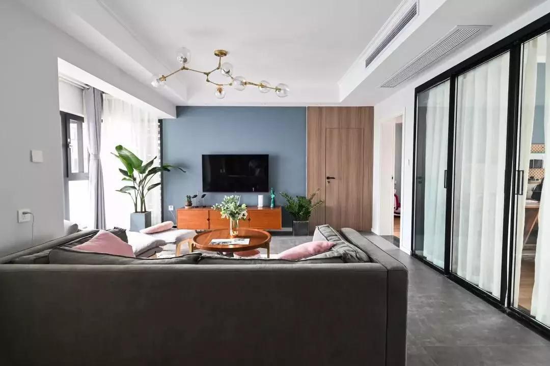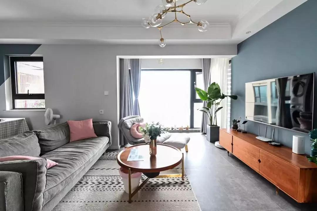 大横厅的格局, 客厅网红分子灯与餐厅金属吊灯相呼应,简约而舒适的灰色沙发点缀以粉色抱枕,简单不失活泼。 几何图案的地毯,丰富了整个区域的视觉感受。 客厅电视墙 以及 餐厅 都使用了灰蓝色乳胶漆,整体统一协调,具有空间