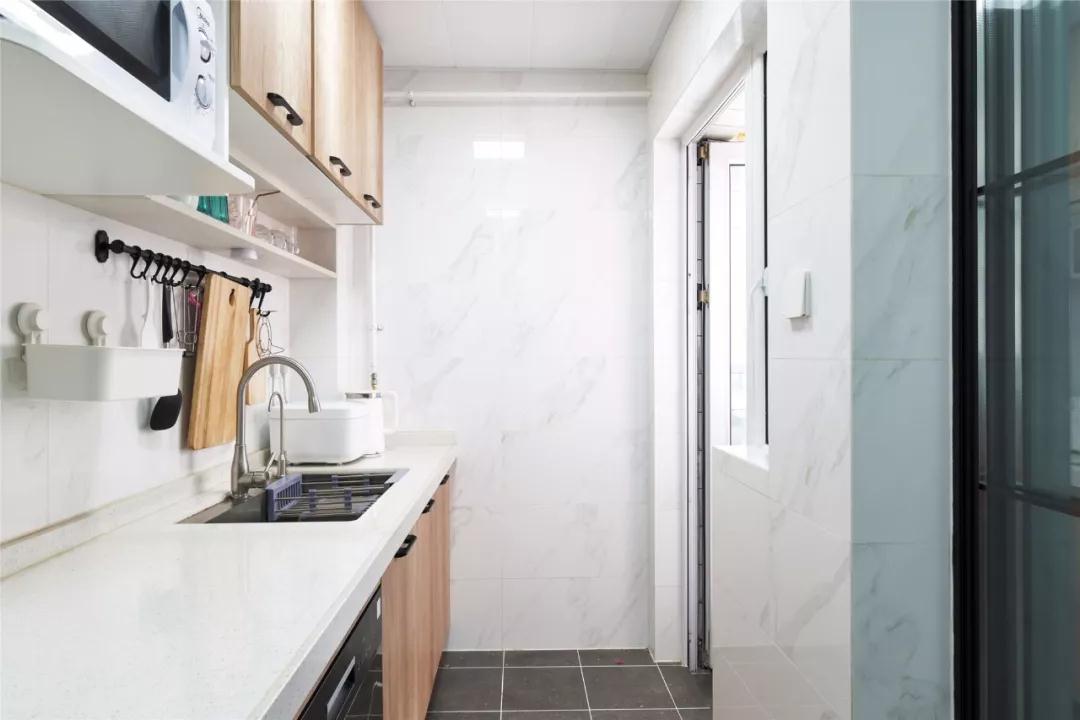 由于整体比较狭窄,采用了深色与白色墙砖做对比的方式,让视觉上更为开阔。