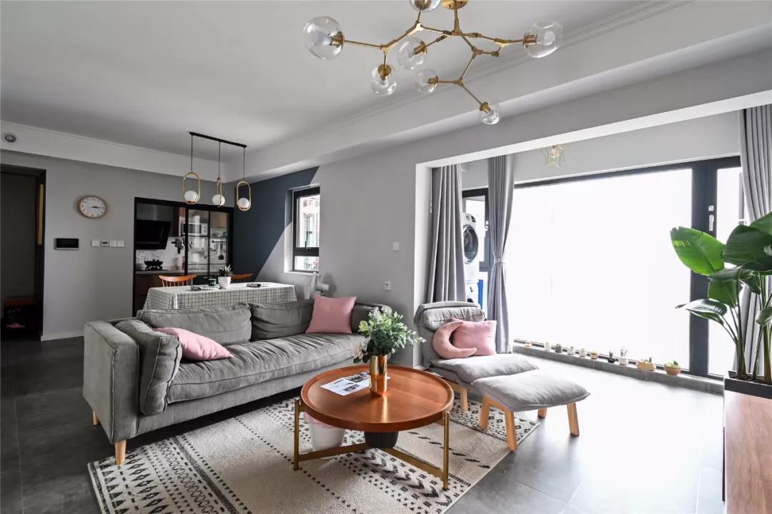 大横厅的格局,客厅网红分子灯与餐厅金属吊灯相呼应,简约而舒适的灰色沙发点缀以粉色抱枕,简单不失活泼。几何图案的地毯,丰富了整个区域的视觉感受。