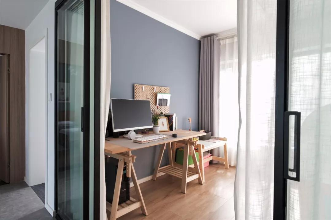 将一整面墙拆掉后,用黑框玻璃门加纱帘的组合,确保了办公区域的隐私性,墙面颜色呼应了餐厅区域,更有连贯性。