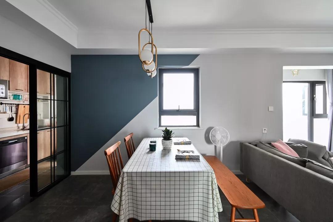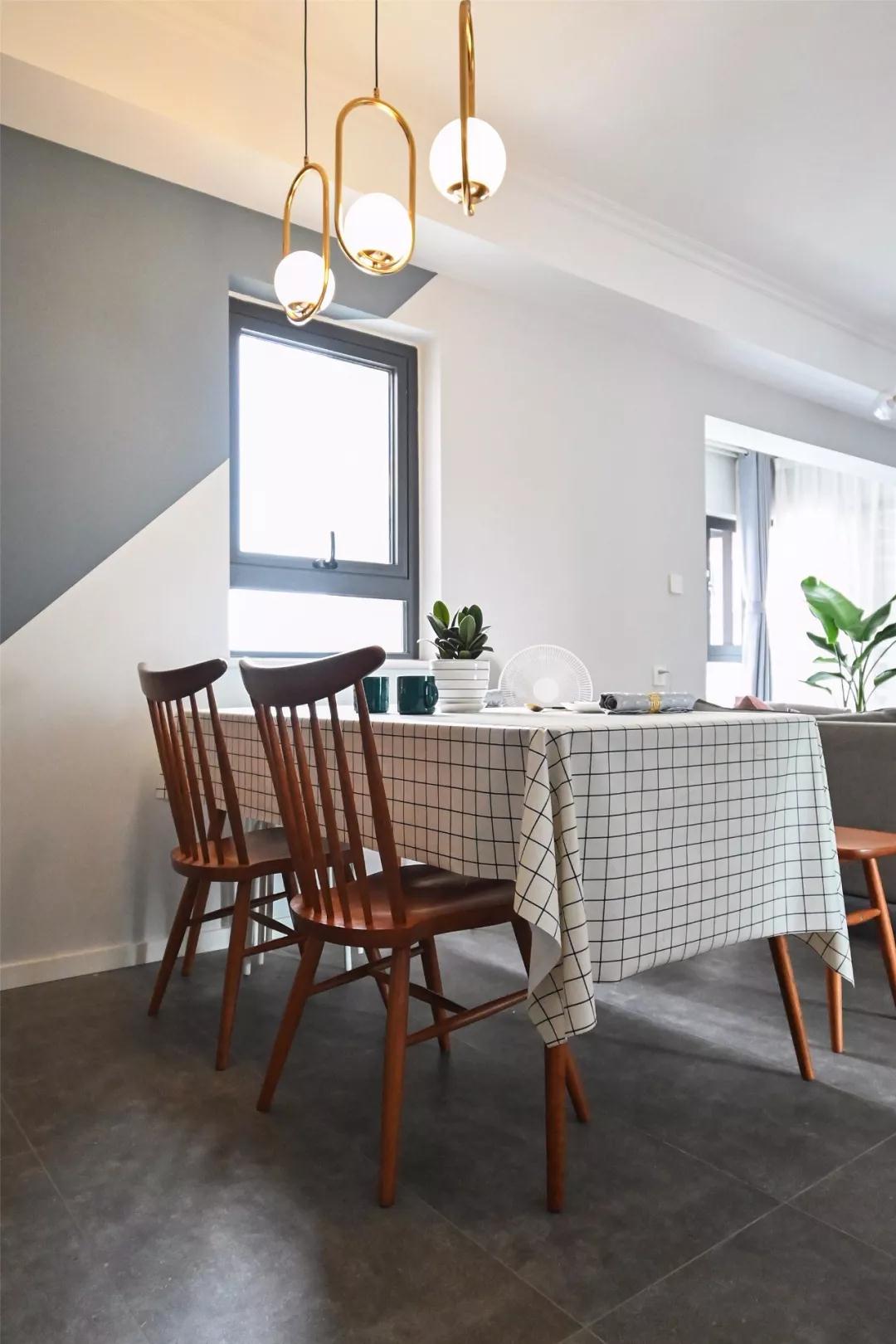 餐厅,墙面颜色进行斜向的拼色处理,非常有造型感。长条形的餐桌搭配木质长板凳+网红温莎椅,营造出一个温馨的就餐空间,同时可以容纳更多客人聚餐使用。