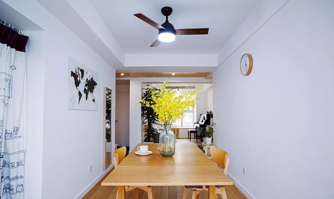 简洁的餐桌椅,个性的吊扇灯,木质挂钟,桌上的跳舞兰尽情绽放着。