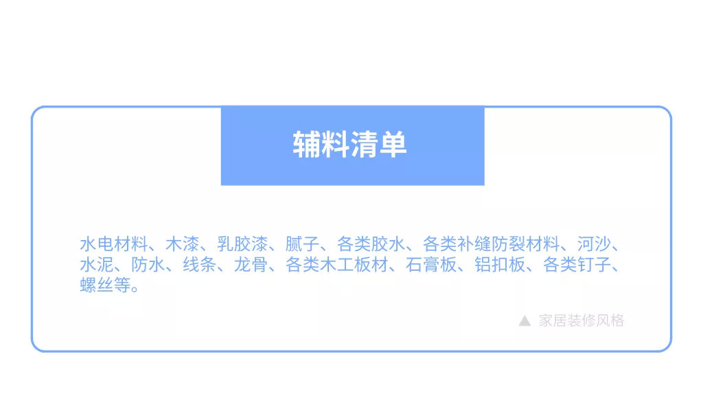 然后购买主材、辅材(如下图)和开工前可购买的材料,如地热采暖在家装之前施工完毕;中央空调开工之前最好能先定下;橱柜在水电改造开工前购买;暖气在设计方案确定后购买。