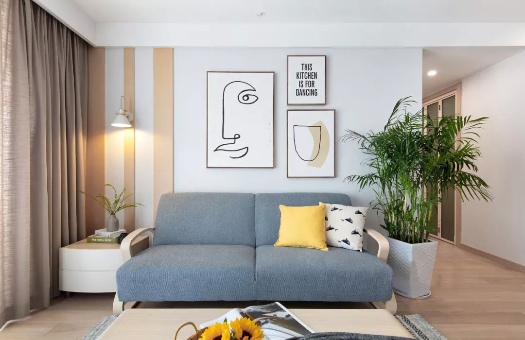 然后家具进场,做好软装搭配,布置好窗帘、窗帘杆、沙发、地毯、装饰画、植物盆栽等等。