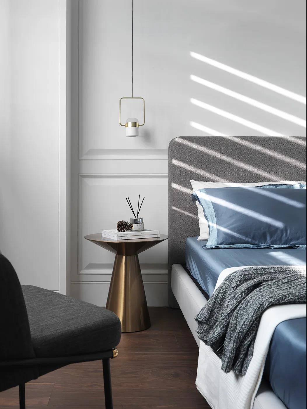 卧室床头墙以带边框造型的饰面板基础,布置布艺床铺与金属质感的床头柜,让睡眠空间充满华丽端庄的大气感。