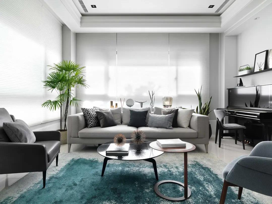客厅双面采光的L形窗户,沙发靠窗布置,搭配丹蓝色的儒雅地毯,还有双拼圆茶几设计,都让空间显得更加的优雅精致。