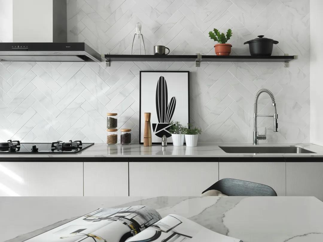 厨房墙面的隔板架上的绿植与瓶瓶罐罐摆设,也让厨房显得更加文艺精致。