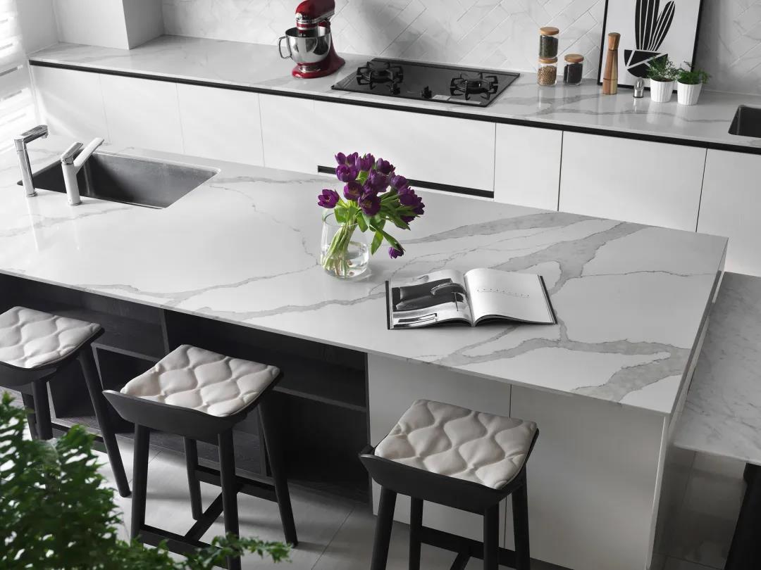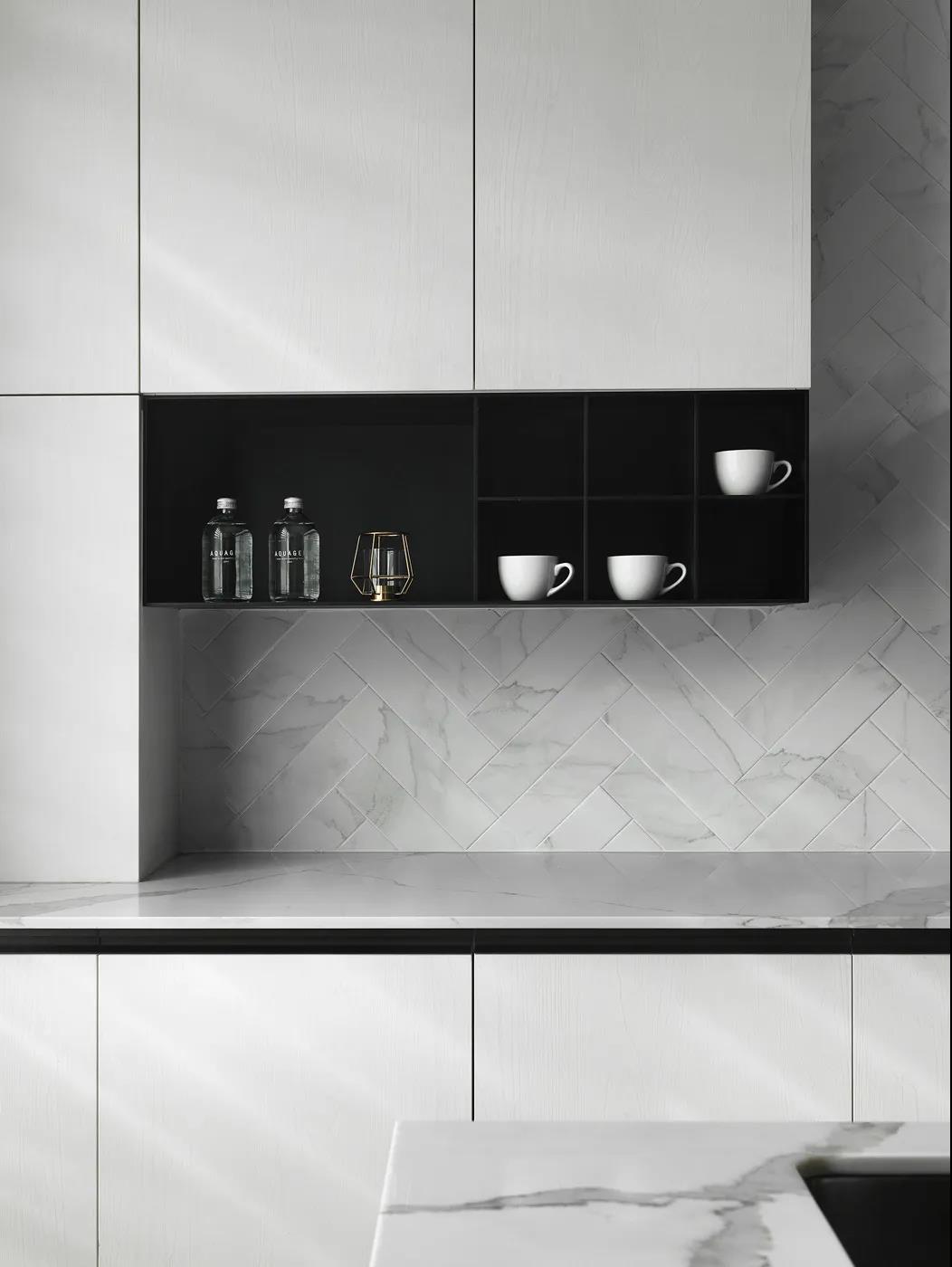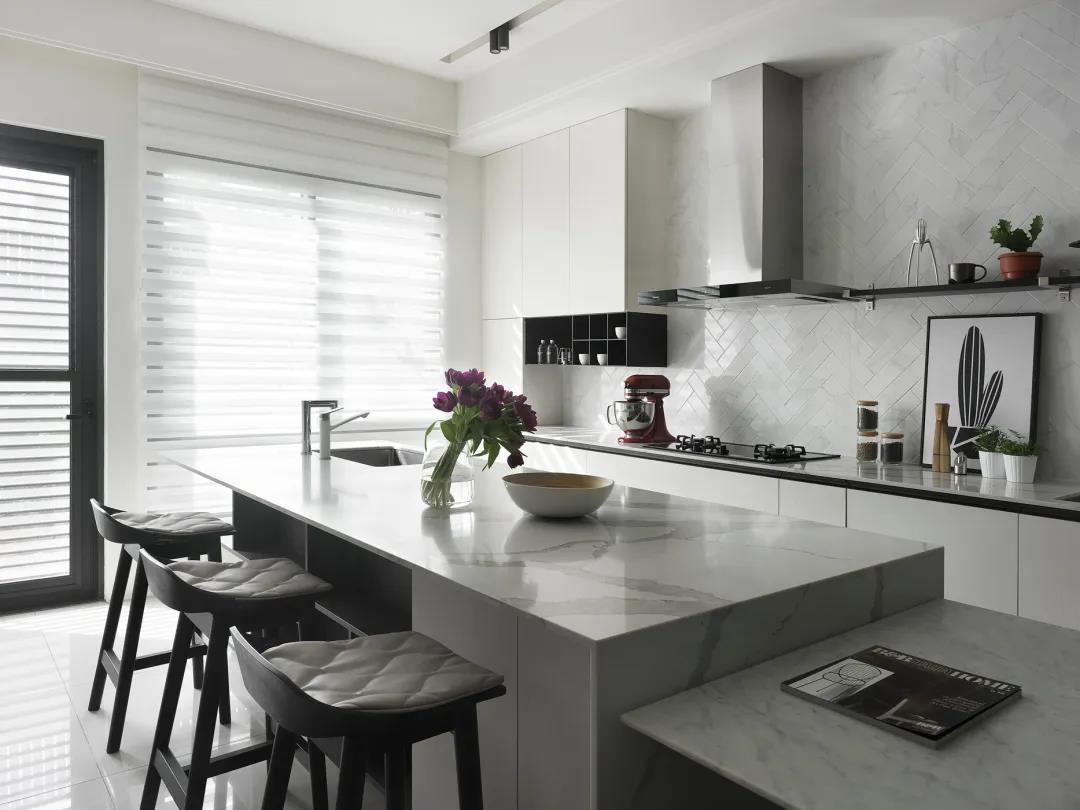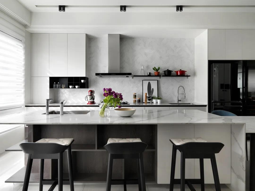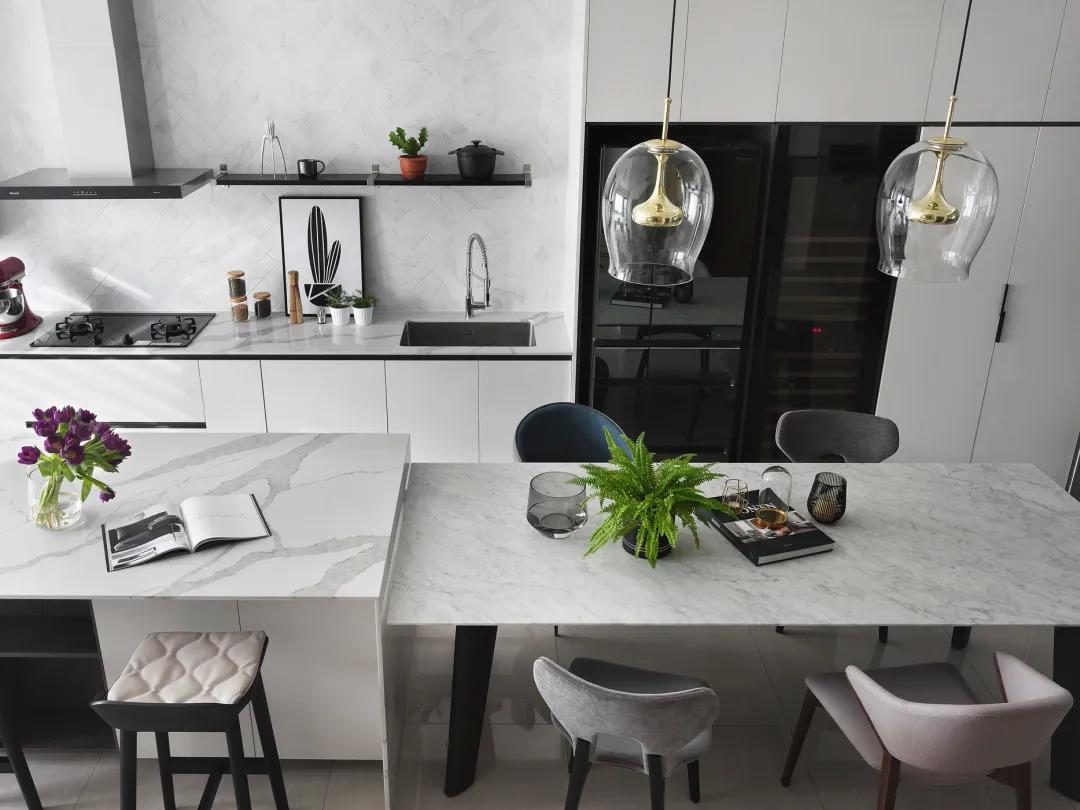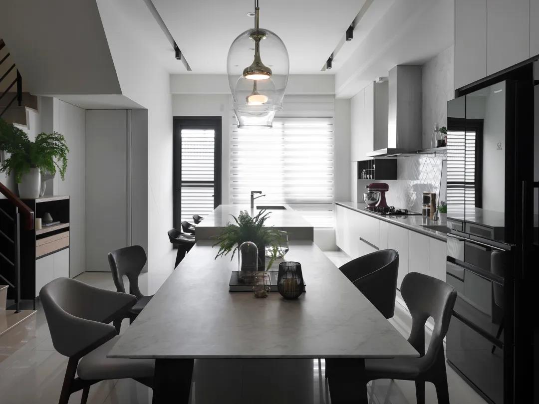 ▲挨着餐桌的中岛台,布置上几张吧椅,营造出一种时尚优雅的餐厨体验