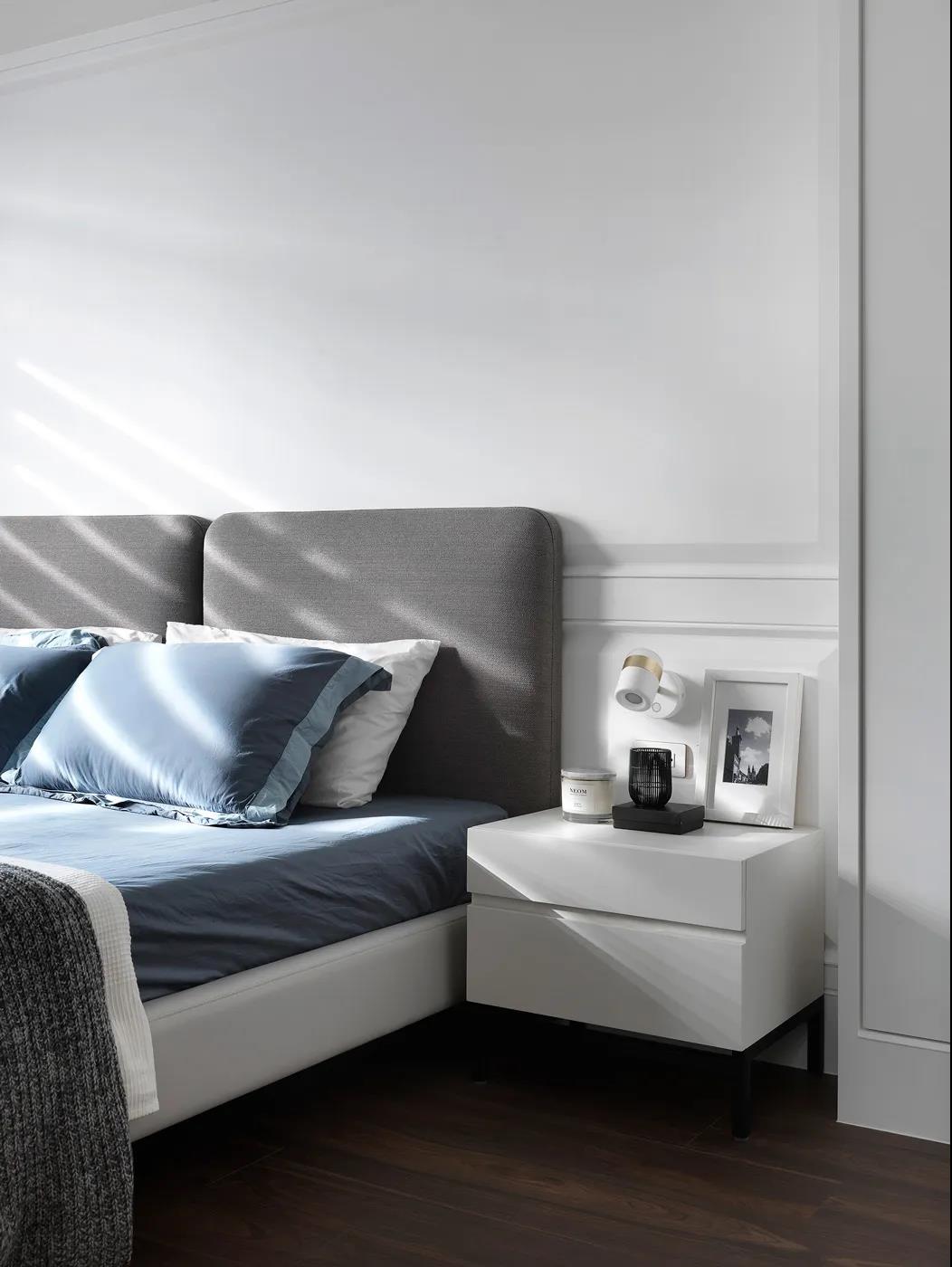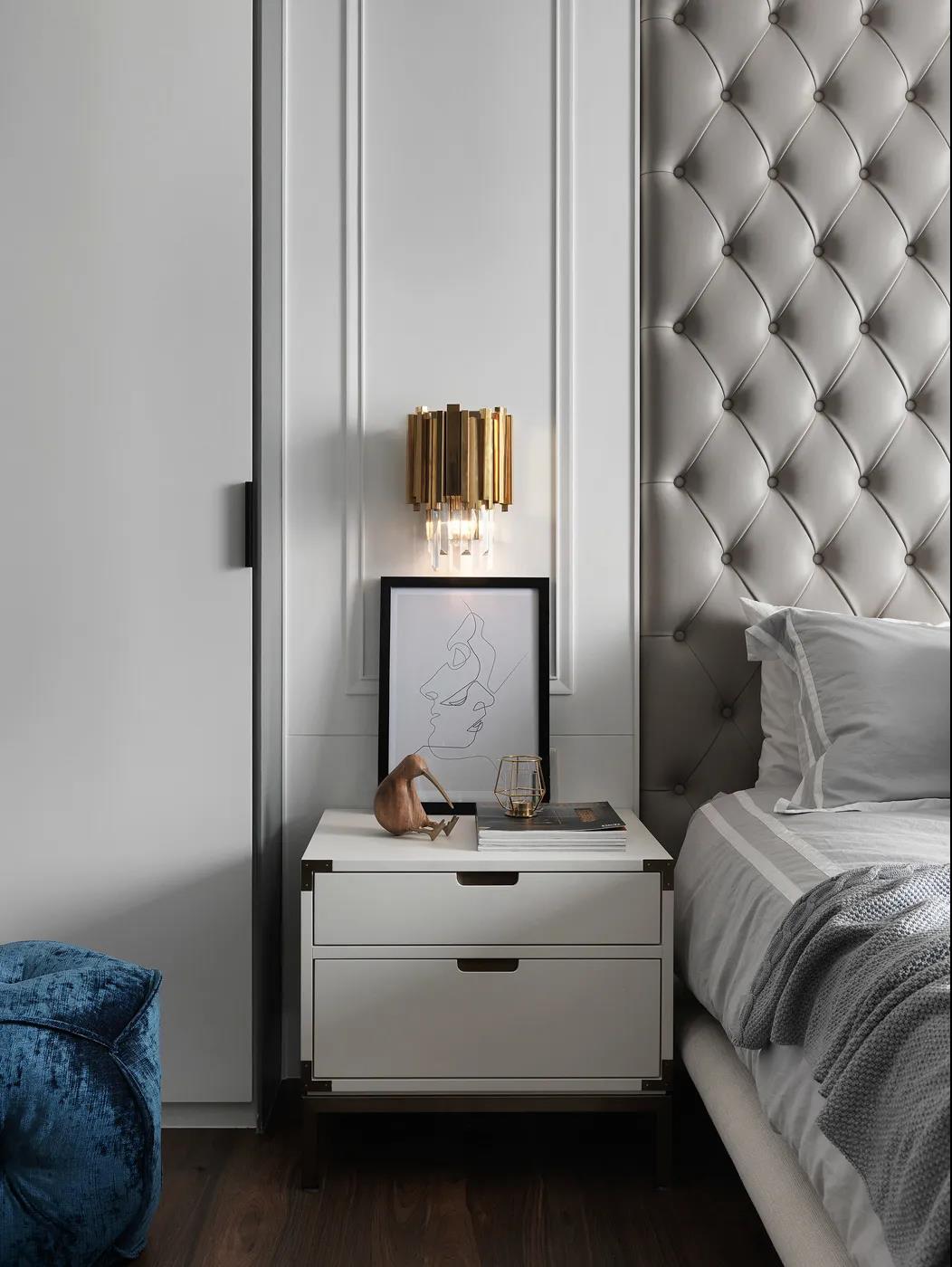 主人房空间在浅灰色的基础下,床头墙是两侧带边框造型的护墙板+中间软包的背景设计,结合金色的壁灯,还有雅白的床头柜,布置出一个华丽温馨的舒适卧室空间。